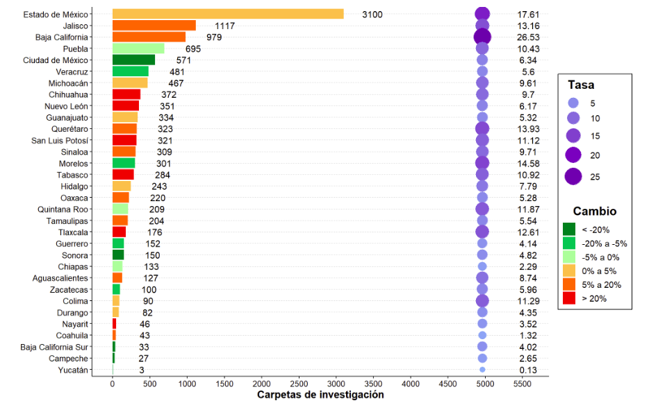 En julio, Estado de México abrió 3,100 carpetas de investigación (CI), lo que lo posicionó como el estado con mayor incidencia de robo de vehículo automotor en el mes, seguido por Jalisco, con 1,117, y por Baja California, con 979. Las entidades con menor número de casos fueron: Yucatán (3), Campeche (27), junto con Baja California Sur (33). Lo anterior se puede apreciar en la gráfica 1. Considerando los casos por cada cien mil habitantes, Baja California tuvo la mayor tasa de registros, con 26.53, mientras que Yucatán, con 0.1, observó la menor incidencia por tamaño poblacional. Jalisco quedó en la posición número 5, con una tasa de 13.16 CI por cada cien mil habitantes. Con respecto al cambio en los casos de robo de vehículo automotor entre julio de 2021, y el promedio de los 12 meses anteriores, en Jalisco se registraron 13.12% más carpetas de investigación.